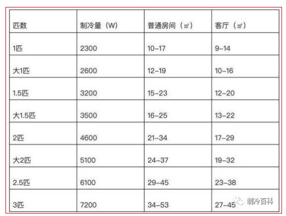 市场上空调的空调匹数和空调的制冷面积有着很大的关系。[本文来源:制冷百科公众号。]通常情况下1匹的制冷量大约为2千大卡,也就是说2千大卡乘以1.162等于2324w。